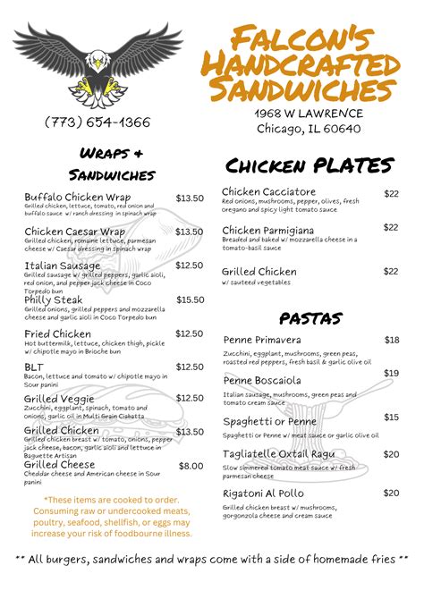 Welcome to Falcons Handcrafted Sandwiches, where we take pride in serving you the most delicious and unique sandwiches in town. Our menu is carefully crafted to satisfy your taste buds with a perfect blend of flavors. From classic favorites to innovative creations, there's something for everyone at Falcons.